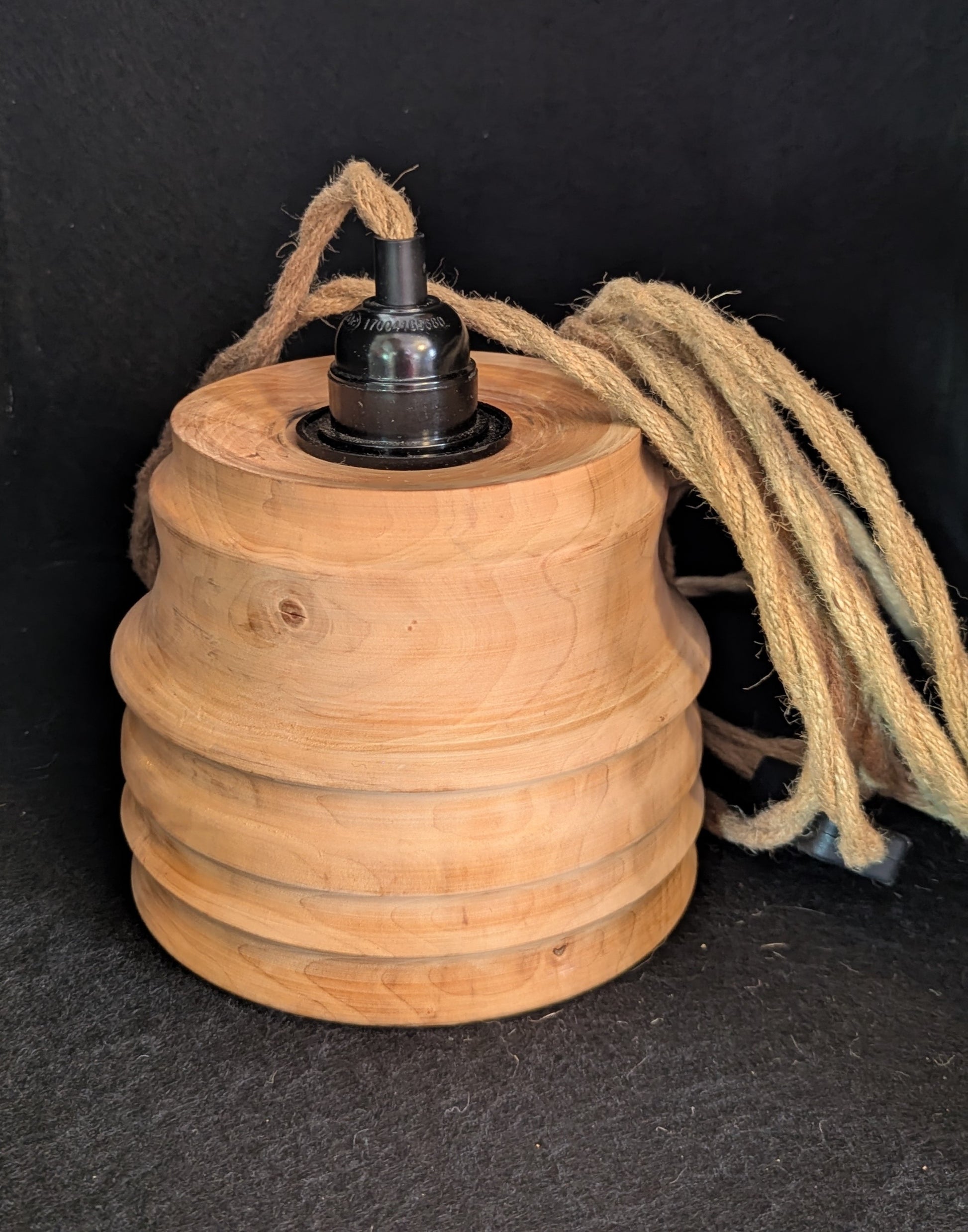 Width 6" X Length 15'. Finished with Howard's Butcher Block Conditioner, low wattage LED bulb, turned from a log found on Wagstaff Road in Fuquay Varina, NC.