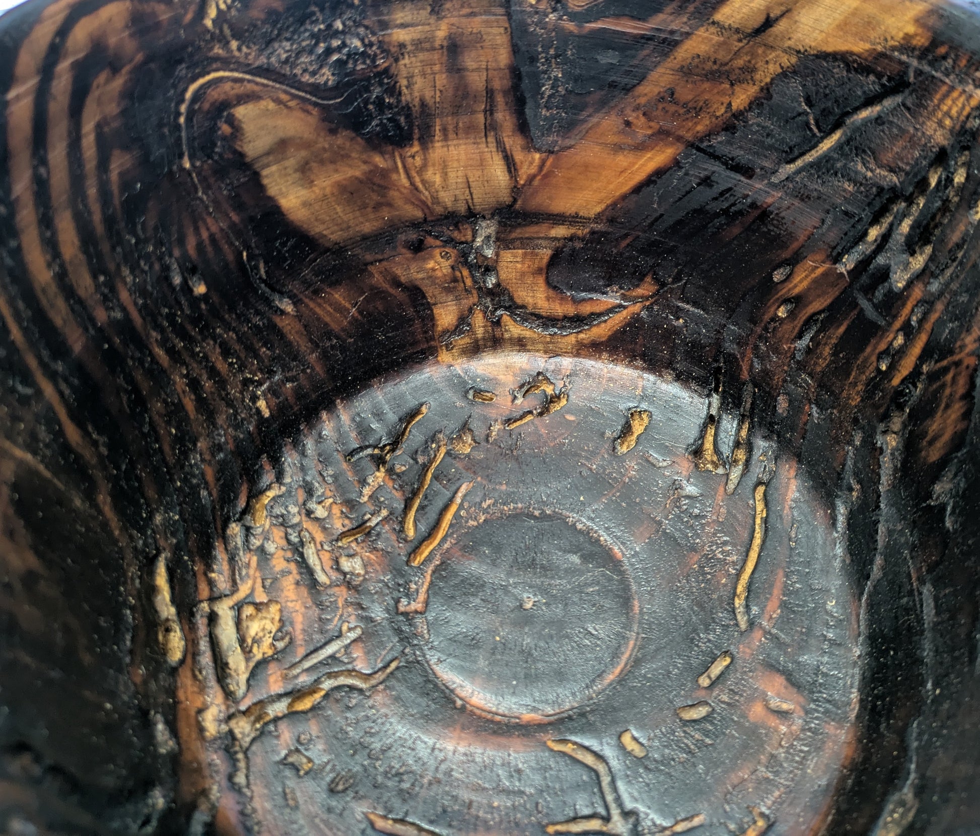 Width 10" X Height 8". Finished with Howard Butcher Block Conditioner after scorching with a torch. Turned from a log found on land cleared for development in Fuquay Varina, NC